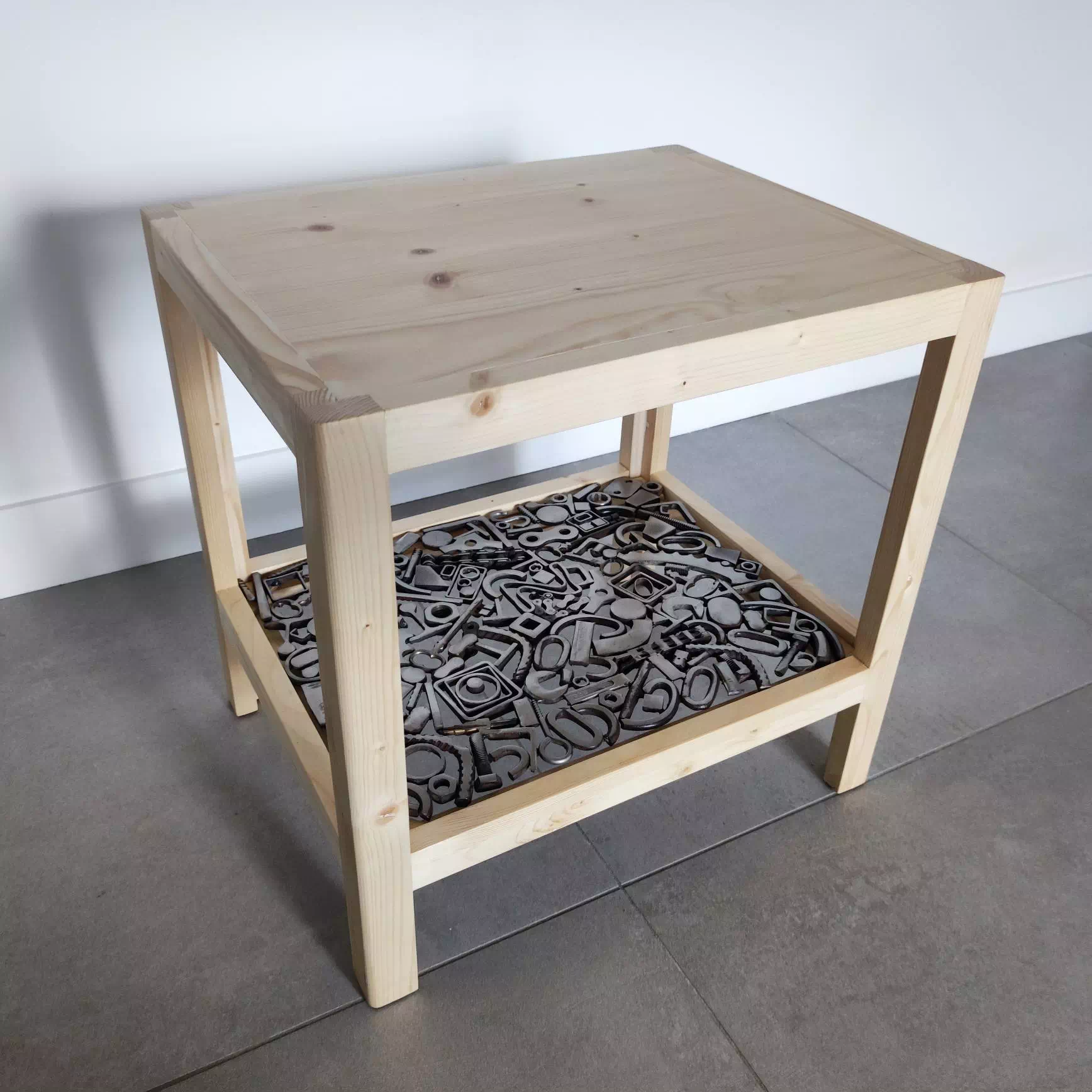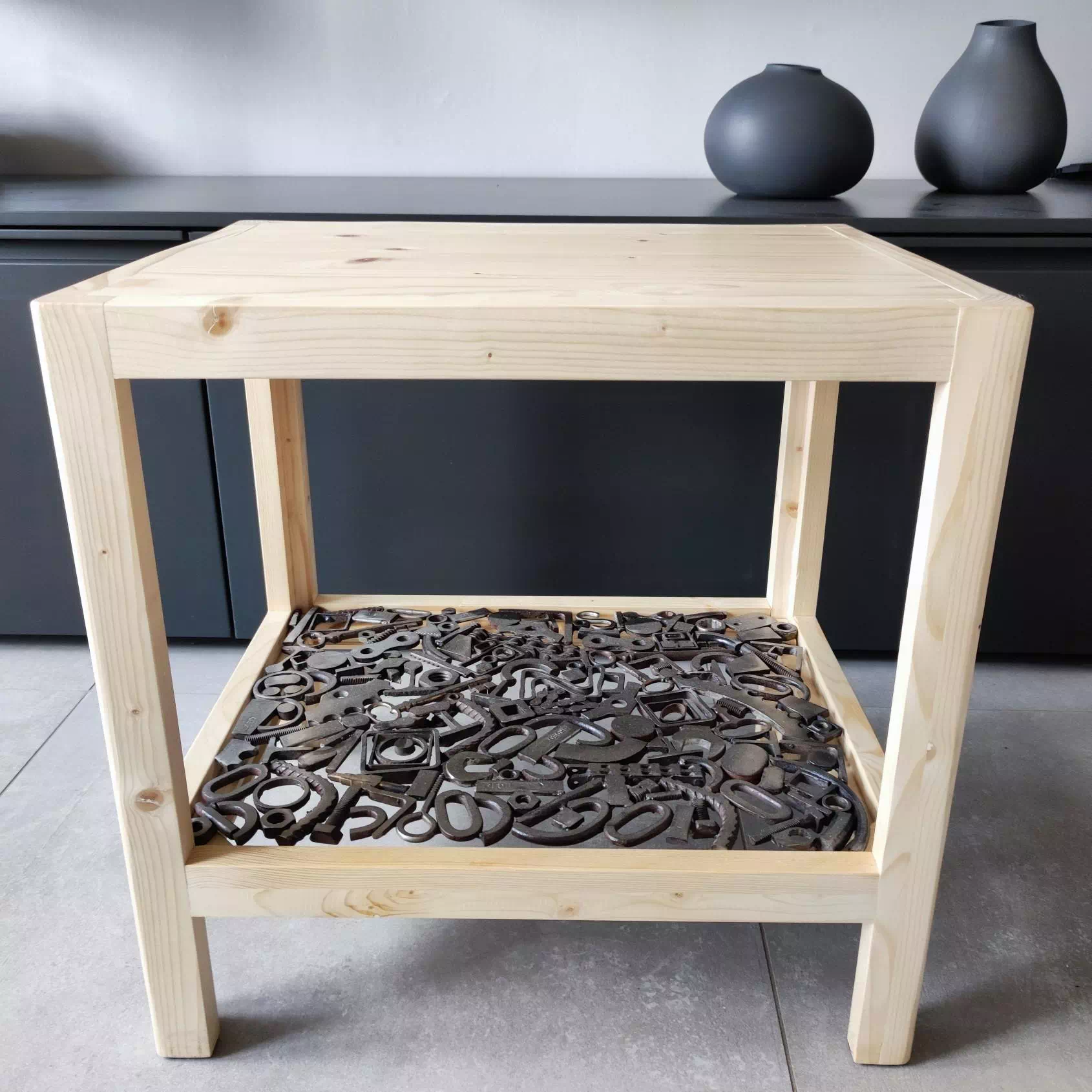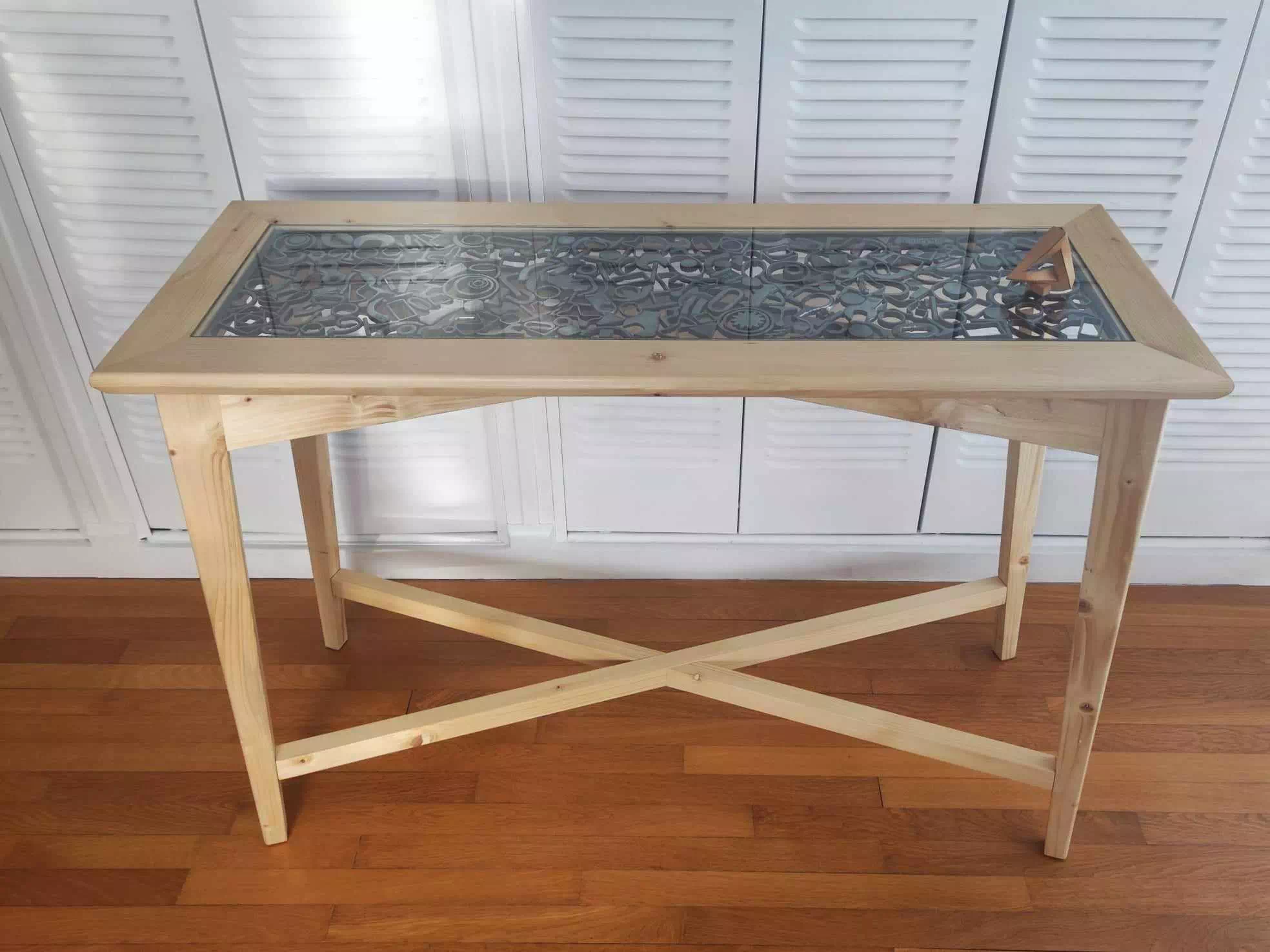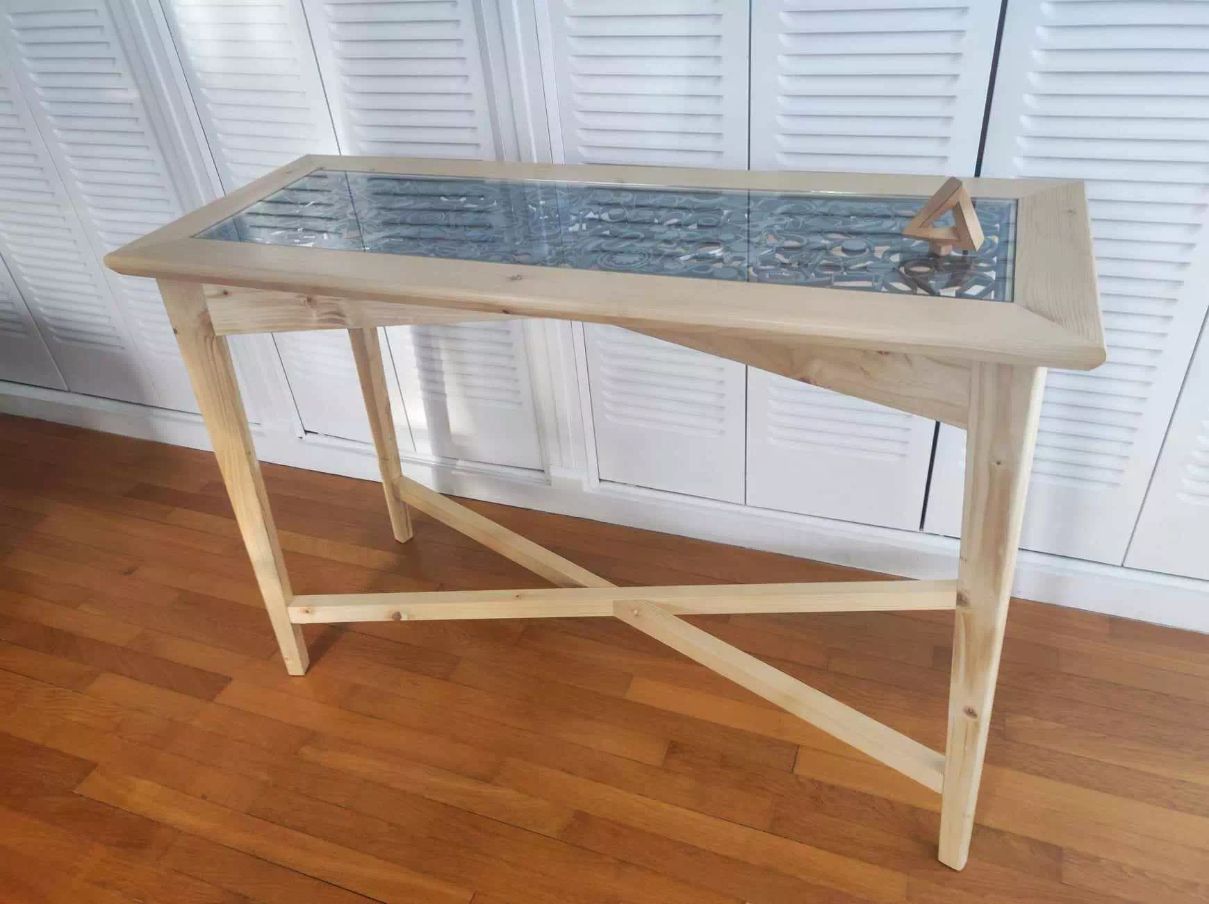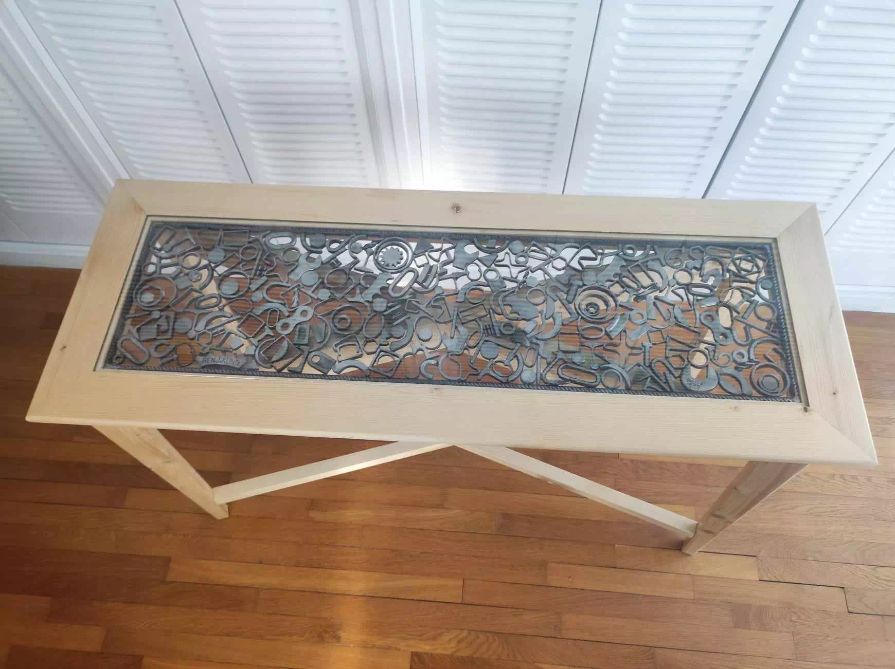 Console réalisée en bois de palette recyclé et décorée d'un plateau en métal composé essentiellement de motifs géométriques. LxPxH env. 107x40x75cm)