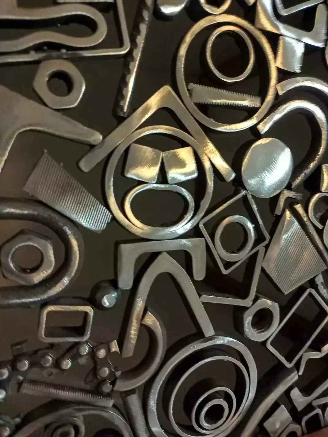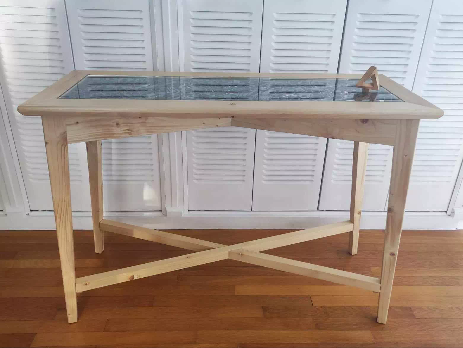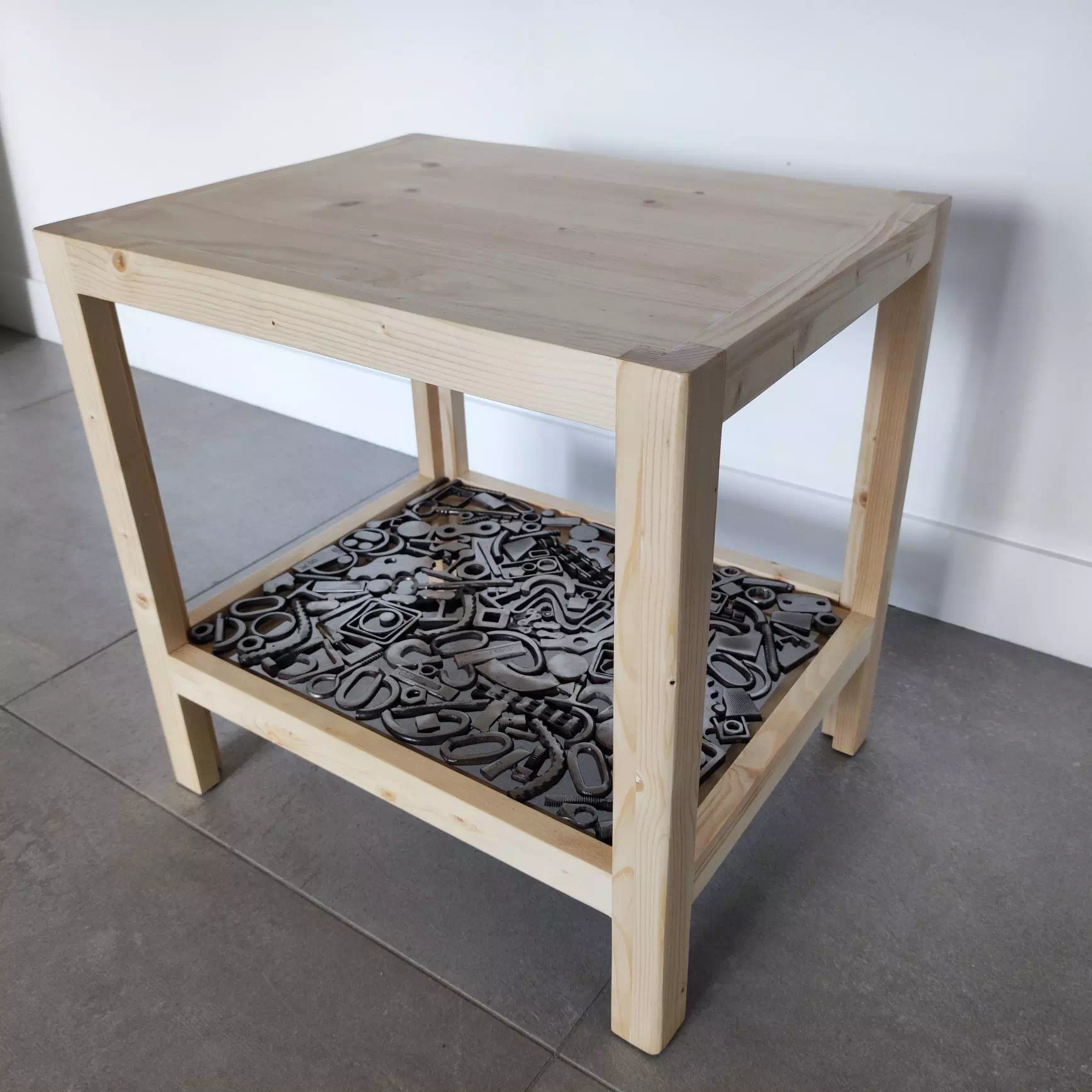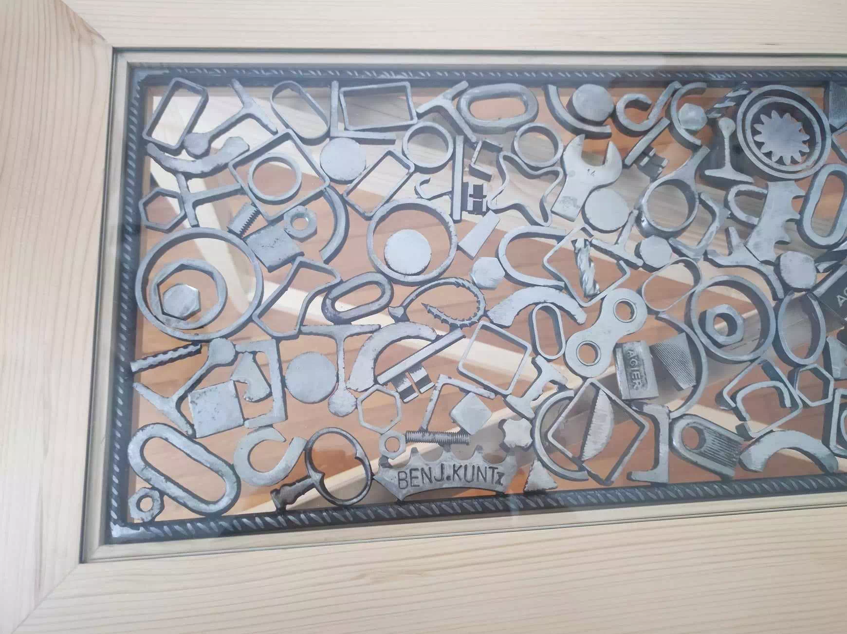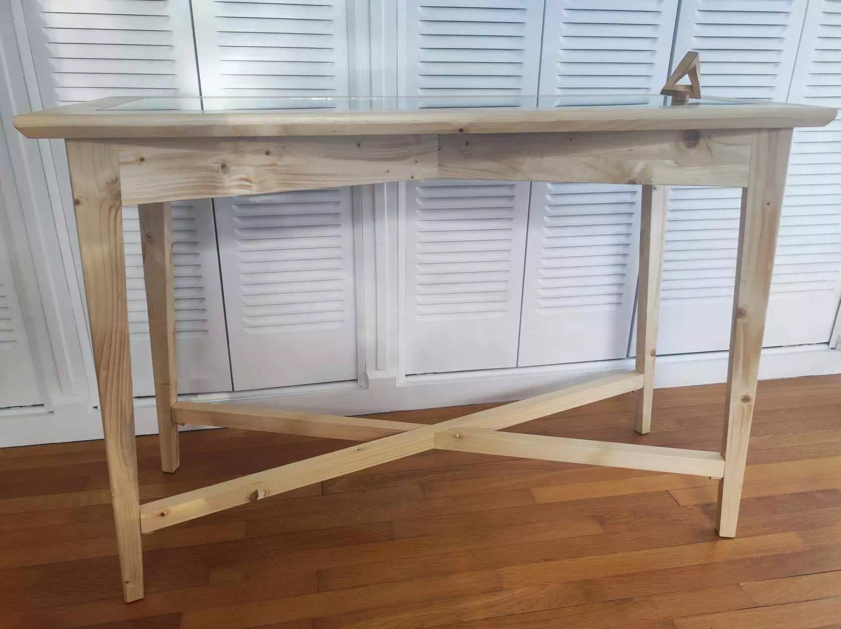 Console réalisée en bois de palette recyclé et décorée d'un plateau en métal composé essentiellement de motifs géométriques. LxPxH env. 107x40x75cm)